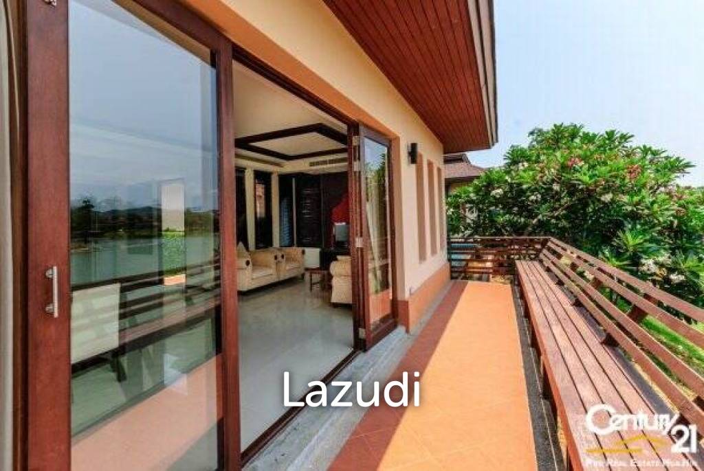 Well designed 3 bed pool villa on lake and nr to the beach. This villa features a separate living, dining and kitchen building adjoined to a 3 bedroom, 3 bathroom building connected by pool and decking areas facing the lake. Outside is a double carport, pool, gardens and the villa is within a mature complex with clubhouse and large pool and cafe and is only a few minutes walk to the beach.