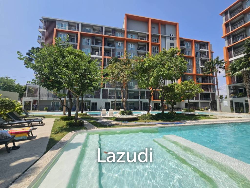 The condo sits Hua Hin102 within a modern residential complex. The setting offers an urban feel with nearby condominium buildings, open green areas, and distant city views. The courtyard pool and landscaped gardens create a relaxed resort-style environment.